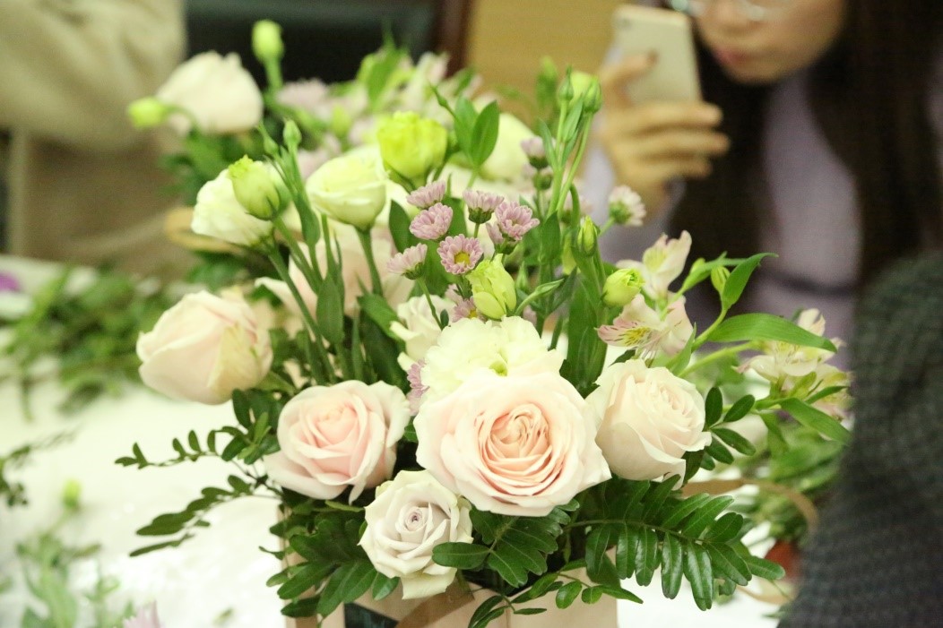 活动中,机关的女神们用自己灵巧的双手,将各种花材修剪、整枝,再根据不同的色彩、形状有层次的搭配在一起。香气怡人的氛围让女神们兴致盎然,经过大家的努力,一束束融合了丰富想象力的时尚、美丽插花作品展现在了大家的面前,大家开心的笑容与花朵相互交融。
