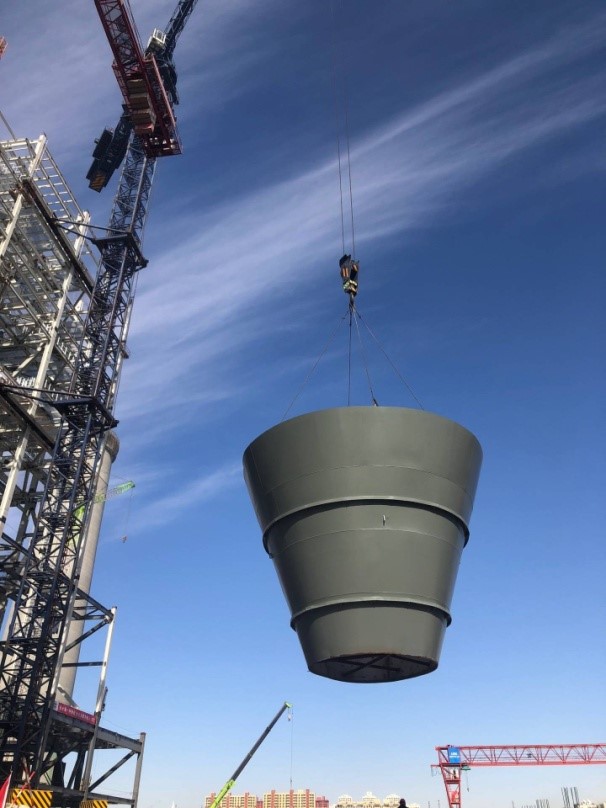 2019年4月3日上午10点30分,伴随着鞭炮的轰鸣声,陕西锦界国华电厂三期项目#5机组***后一支煤斗锥体平稳就位,这标志着#5机组钢煤斗顺利吊装完成。